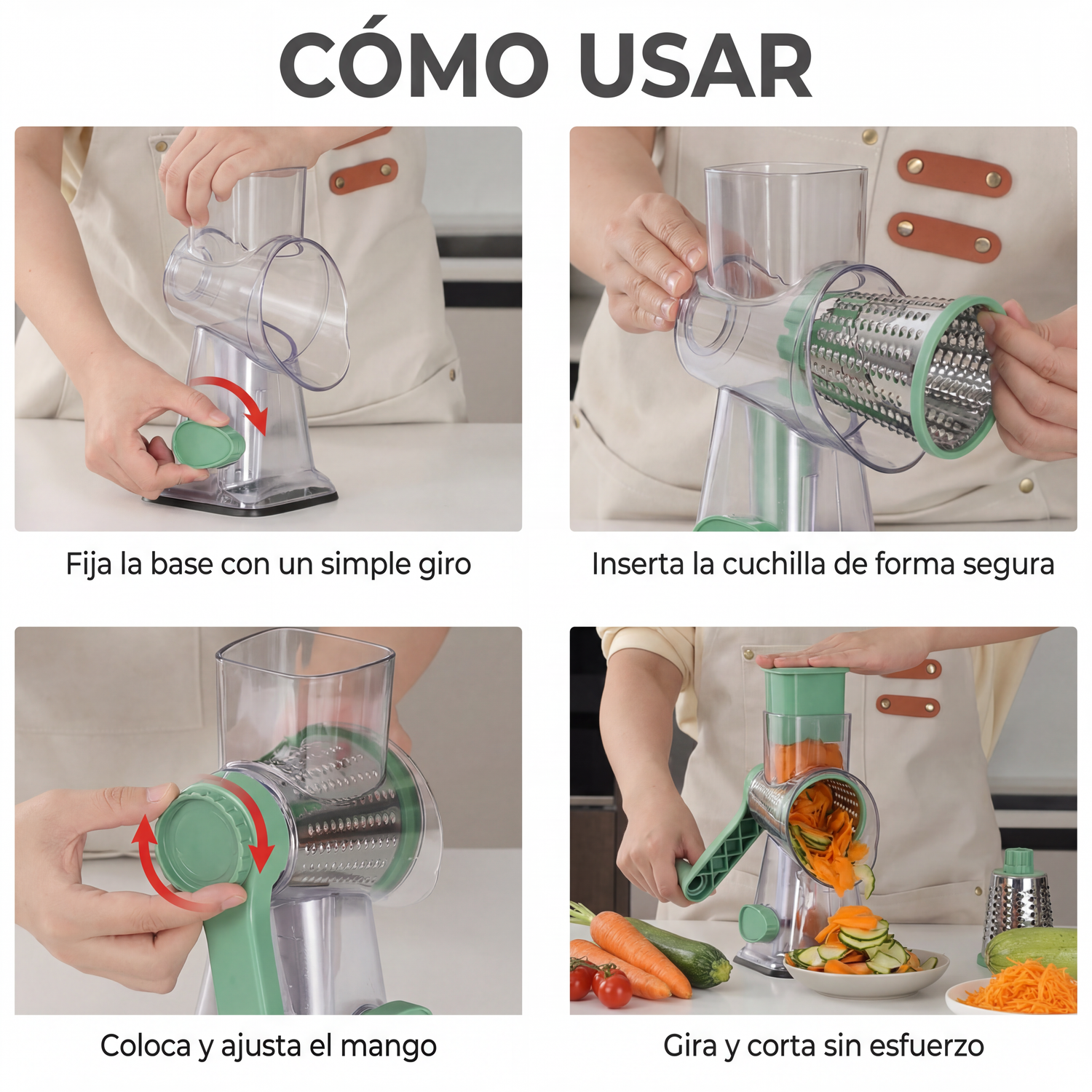 Solo tienes que girar para cortar, rallar o laminar sin esfuerzo.