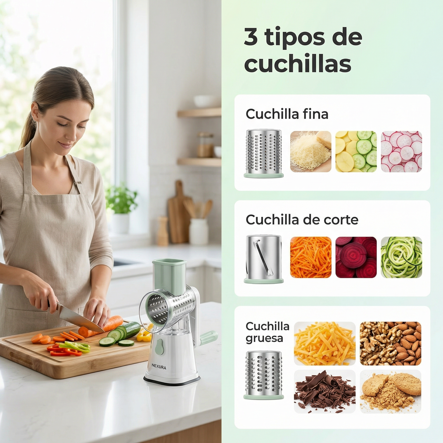 Incluye3 cuchillas intercambiablespara cortar, rallar y laminar fácilmente.