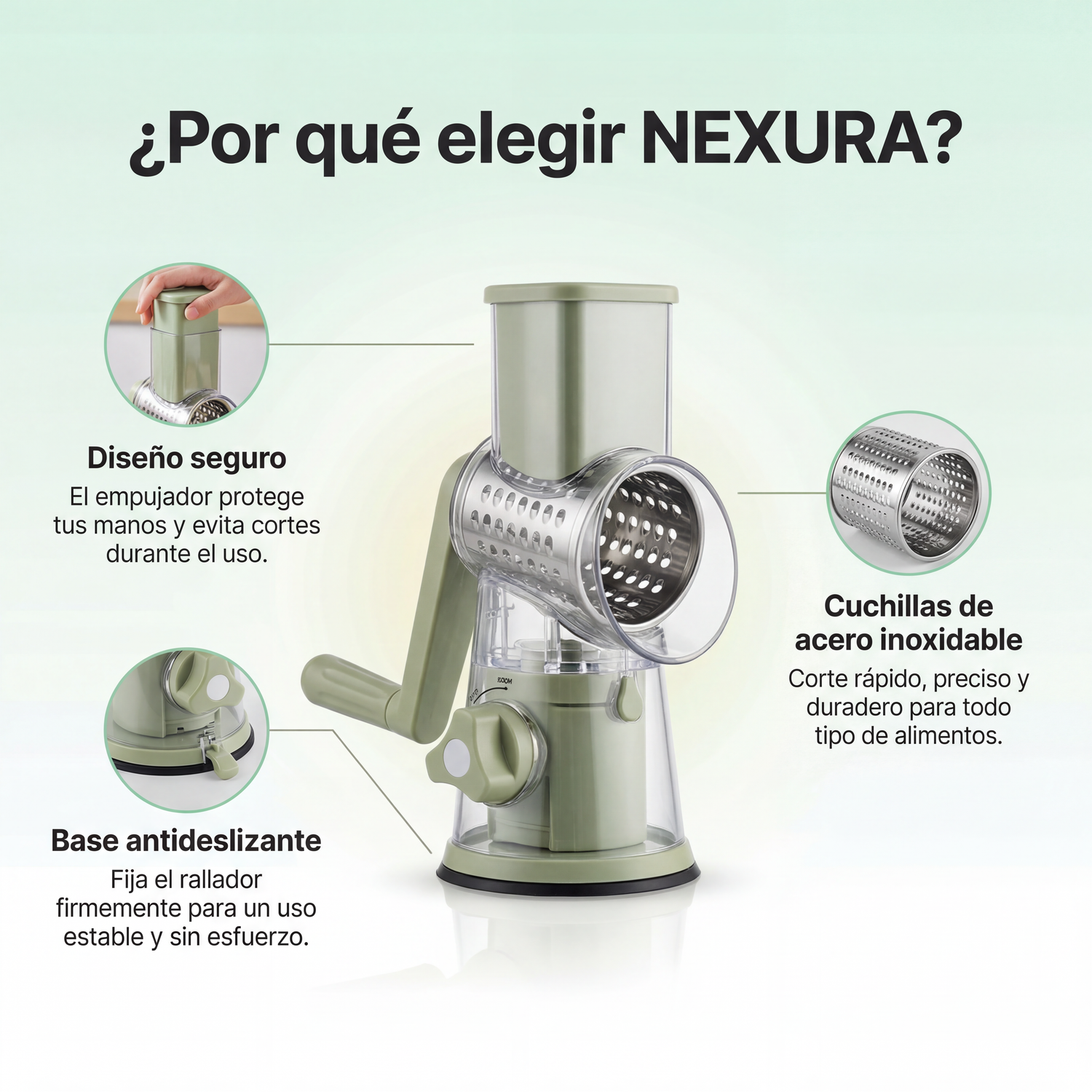 Diseño seguro que protege tus manos, base antideslizante para máxima estabilidad y cuchillas de acero inoxidable para un corte rápido y preciso.
